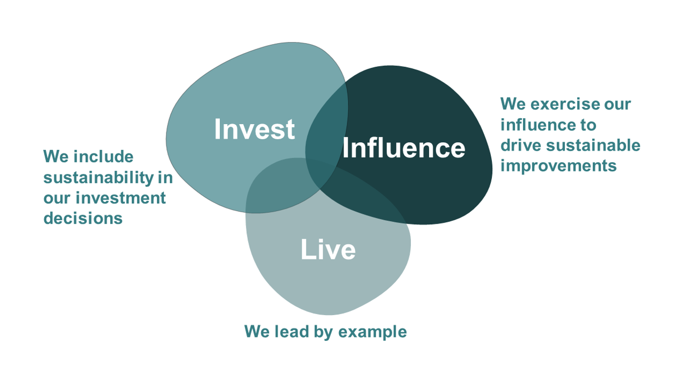 Our approach is structured around the three dimensions of Invest, Influence, and Live, all harmonizing with how we work in our different investment strategies and over investment cycles. Live is also addressing our own operations and offices. Our approach is also tied to three central commitments.